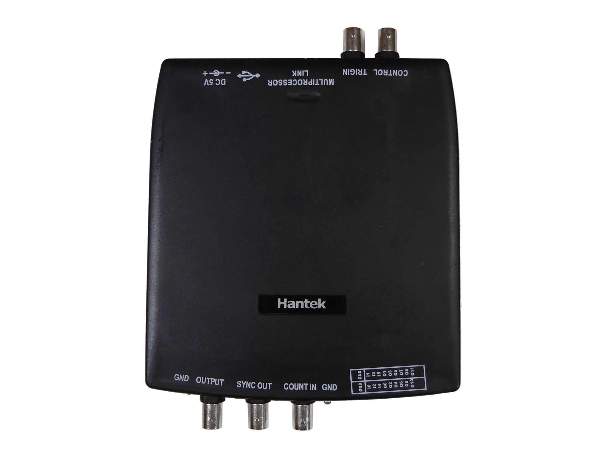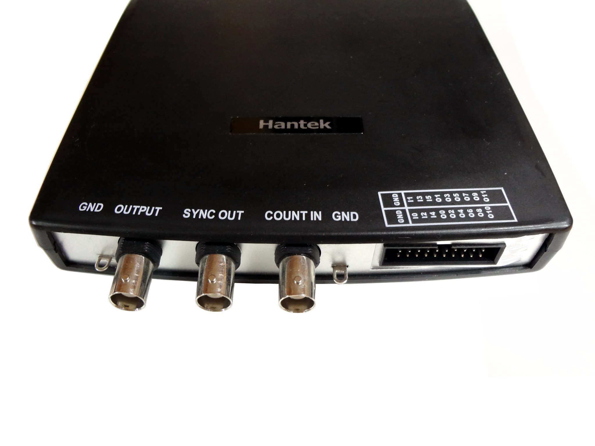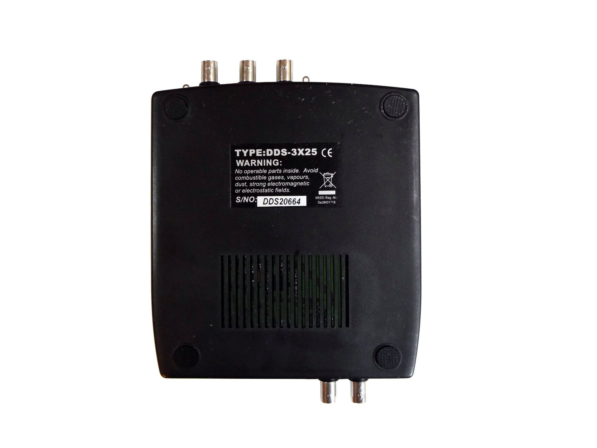 The Hantek DDS-3X25 is a 25MHz PC-based function generator. It has no external controls, requiring a USB connection to a computer.
