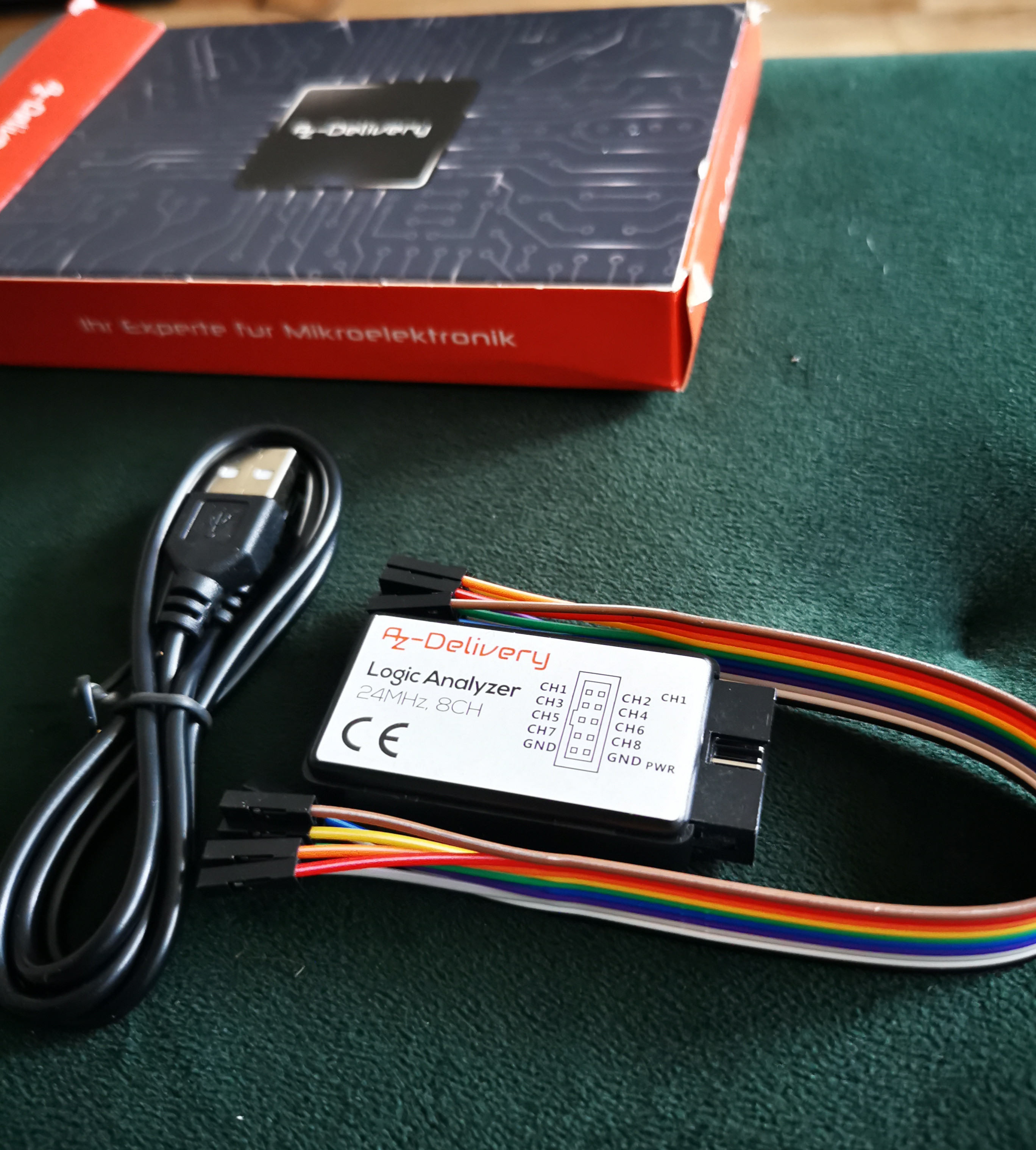 The AZ-Delivery Logic Analyzer is a standard USB Cypress FX2 based 8-channel 24 MHz logic analyzer, which has a strong resemblence to VKTECH saleae clone.