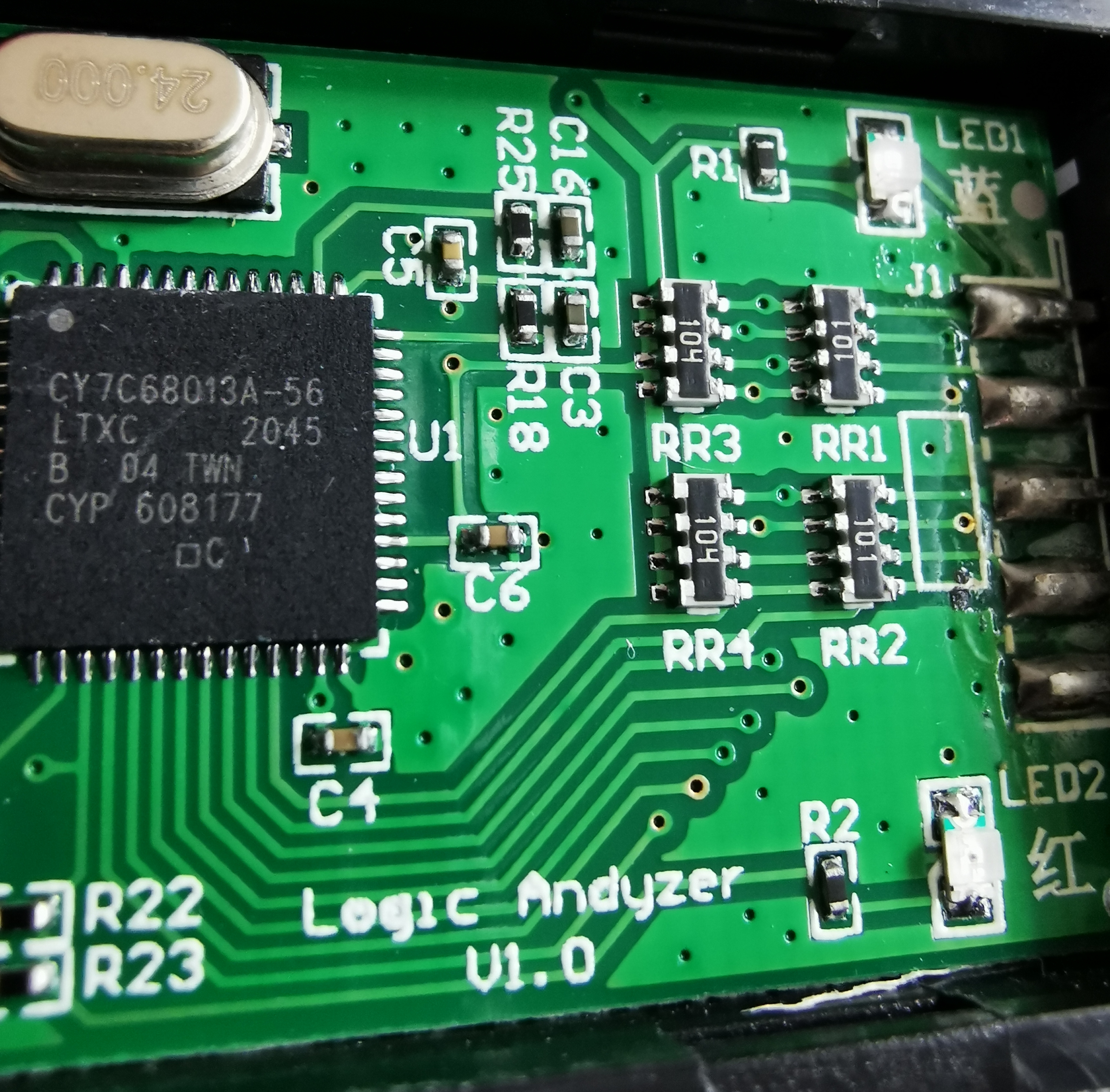 - Main chip: Cypress CY7C68013A-56LTXC (FX2LP in QFN package)