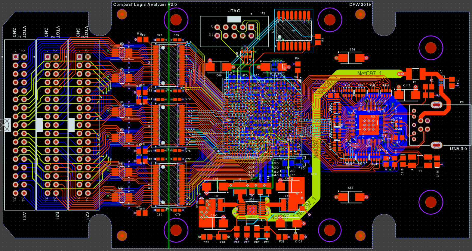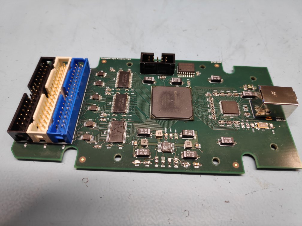 CoLA - Compact Logic Analyzer is an USB3.0 based 96ch/25MHz, 48ch/50MHz or 24ch/100MHz logic analyzer/pattern generator, with built-in hardware pattern triggers, supporting all logic levels from 1.65V to 5.5V. It uses an Intel/Altera Cyclone V FPGA for digital aquisition and FTDI FT601B for 5Gbps USB3.0 support. To limit data transfers, it uses Run Length Encoding (RLE) as well as frame omission. Its compact design and versatility, as well as future upgradability and a DIY approach makes CoLA an interesting project.