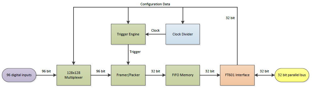 Inside the FPGA, the logic analyzer parts is divided into three major parts. First, the 96 inputs are routed through a connection matrix-like multiplexer, so every physical input can be routed freely onto every one of the 96 possible input channels. Secondly, the input channels are fed though a framer/packetizer, which outputs frames with a proper preamble and data compression. These frames are stored in a data buffer, ready to transmit. The third and final part is the communication interface with the FT601B chip, that sends data from the buffer and receives configuration information.