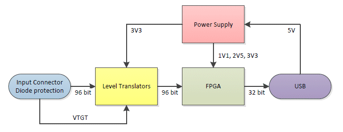 The schematics of this design can be divided into 5 major blocks. The Input Connector with its Diode Protection devices, the Voltage level Translators, the FPGA as the heart of the device, the USB interface and the Power Supply. All IC's are sufficiently provided with decoupling capacitors, with 2 different values to cover a wider frequency range. The analog PLL voltages of the FPGA are additionally decoupled by means of a ferrite bead. The power supplies have a high switching frequency, but large bulk capacitors of 100uF are provided to handle any kind of current spikes.