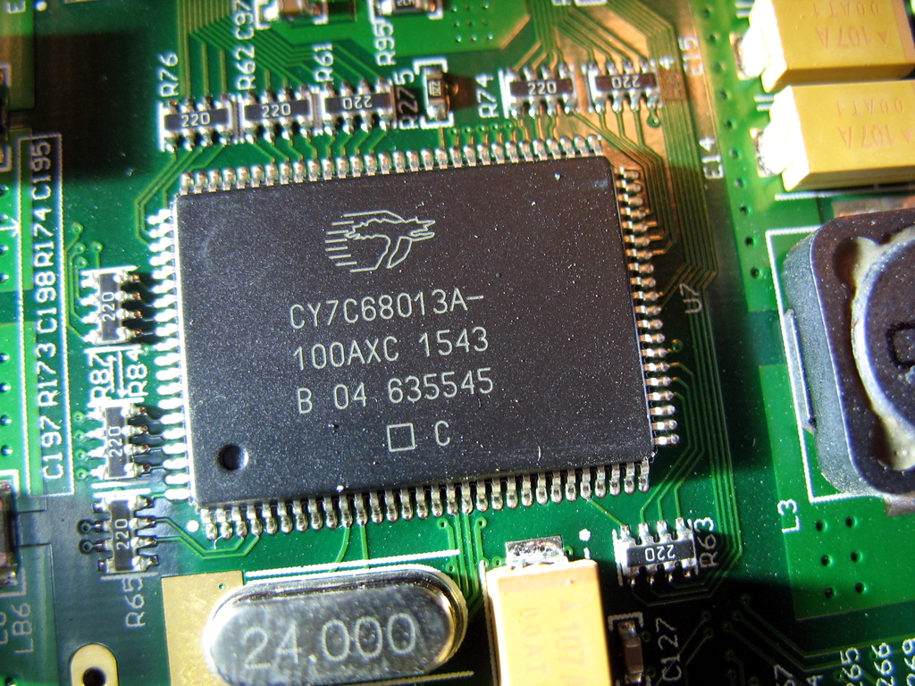 - Cypress FX2LP CY7C68013A-100AXC (USB 2.0 HS controller, TQFP100)