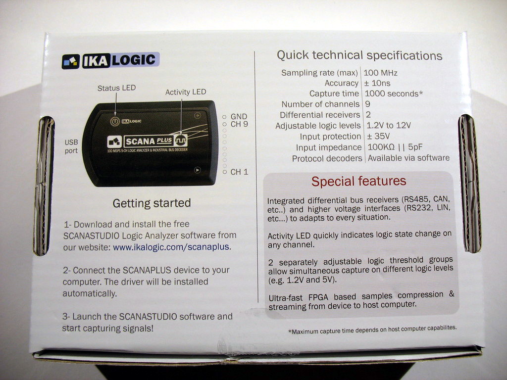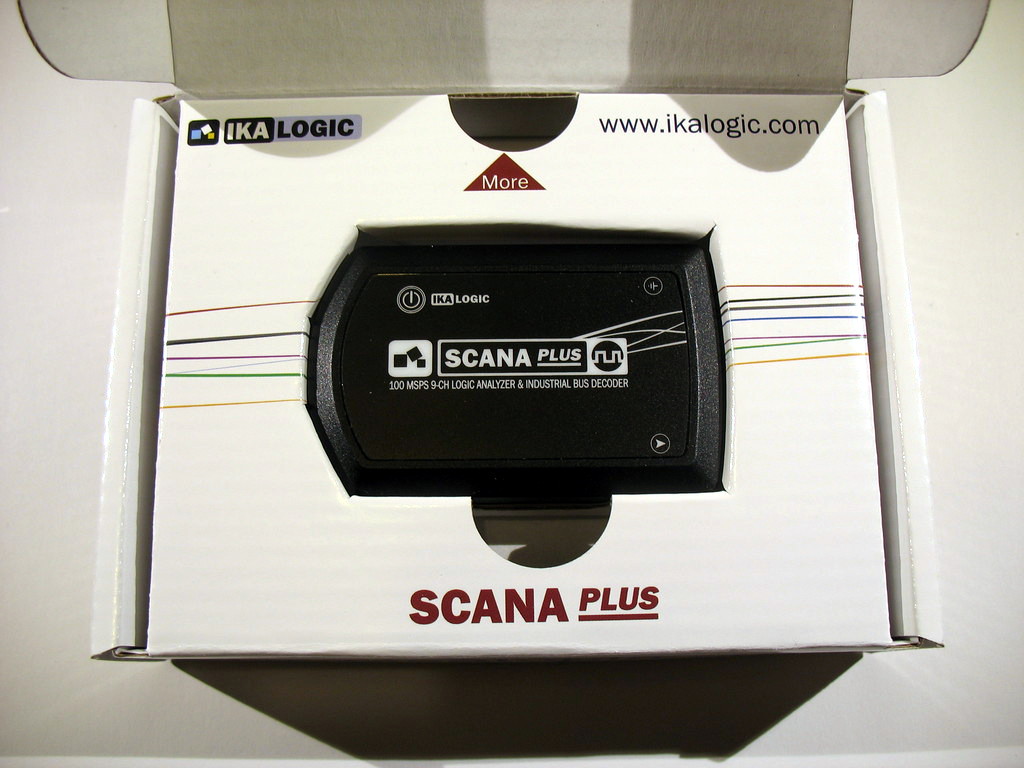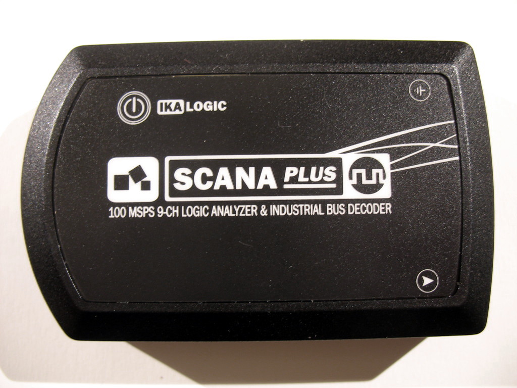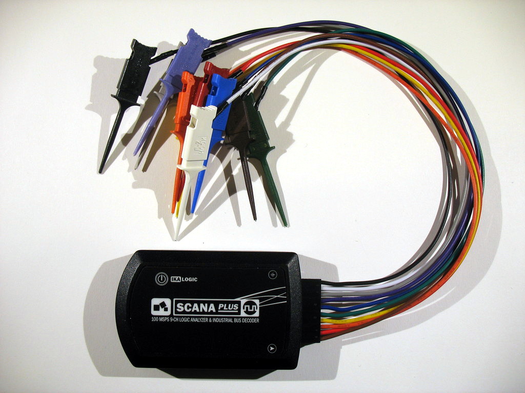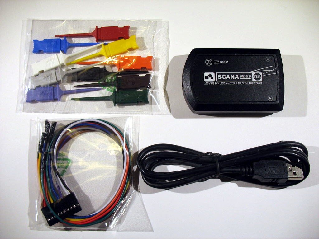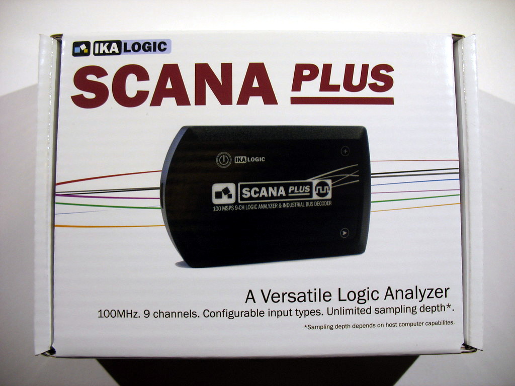 The IKALOGIC ScanaPLUS is a USB-based, 9-channel logic analyzer with up to 100MHz sampling rate.