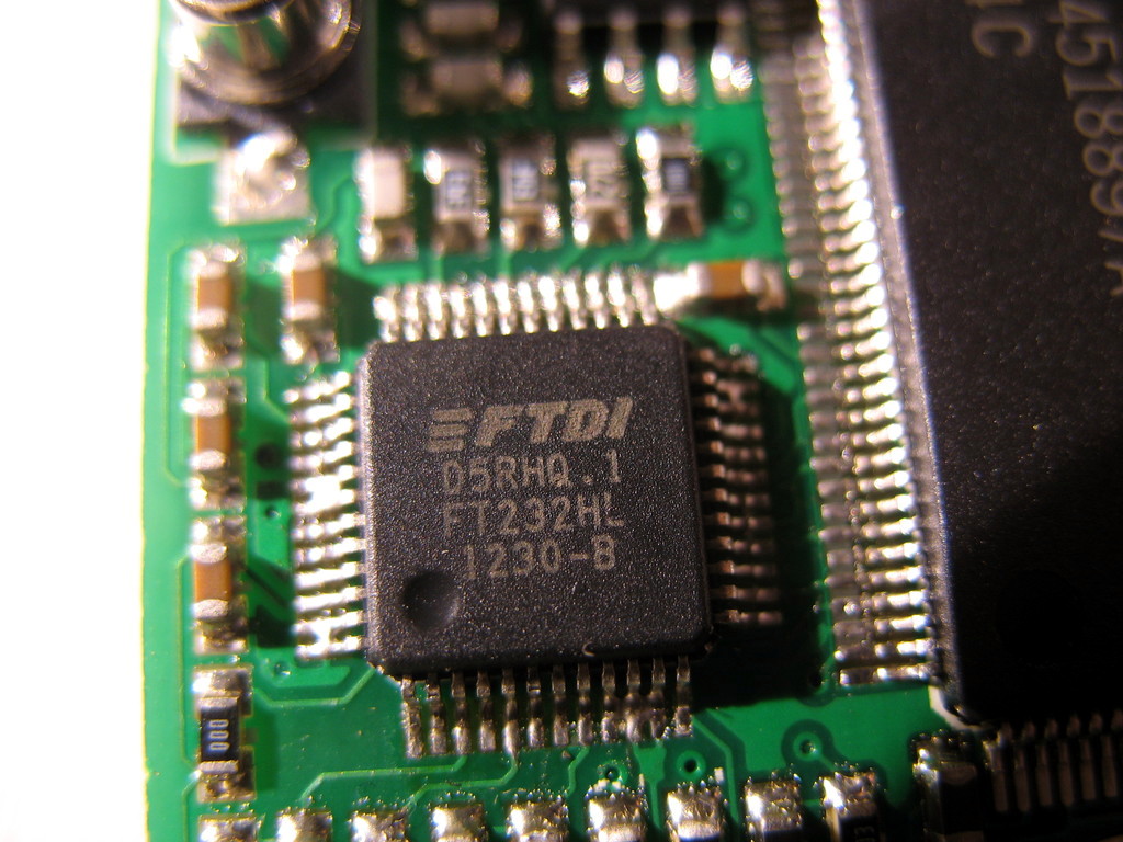 - Hi-speed single-channel USB UART/FIFO: FTDI FT232H (markings: "FTDI D5RHQ.1 FT232HL 1230-B") (datasheet)