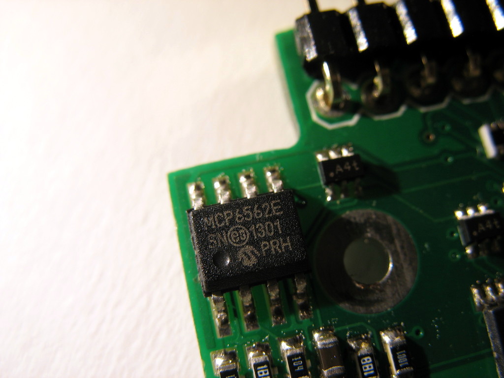 - Dual 1.8V low-power push-pull output comparator: Microchip MCP6562 (markings: "MCP6562E SN e3 1301 RPH") (datasheet)