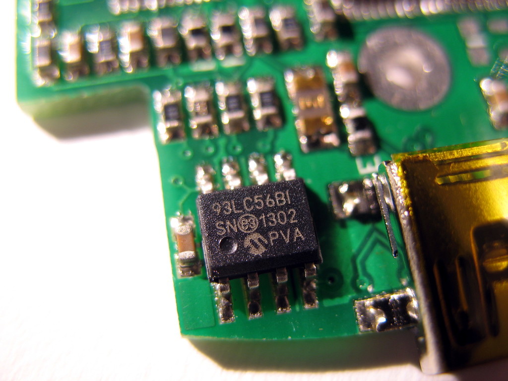 - 2Kbit Microwire EEPROM: Microchip 93LC56B (markings: "93LC56BI SN e3 1302 PVA") (datasheet)