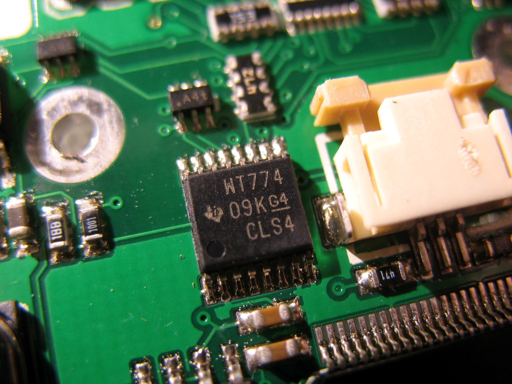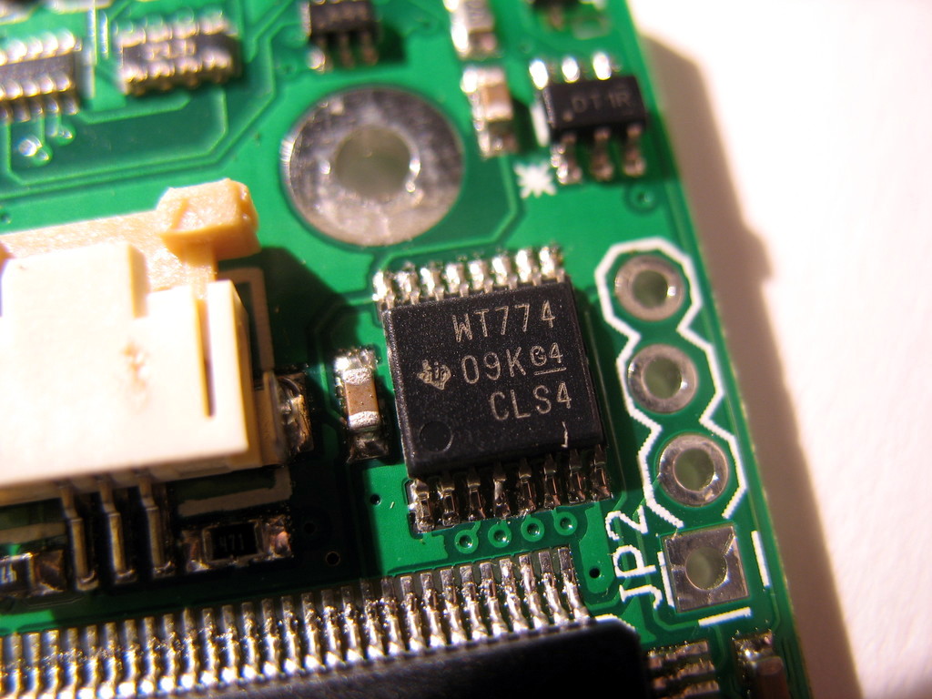 - 2x 4-bit dual-supply bus transceiver with configurable voltage translation & 3-state outputs: Texas Instruments SN74AVC4T774 (markings: "WT774 09K G4 CLS4") (datasheet)