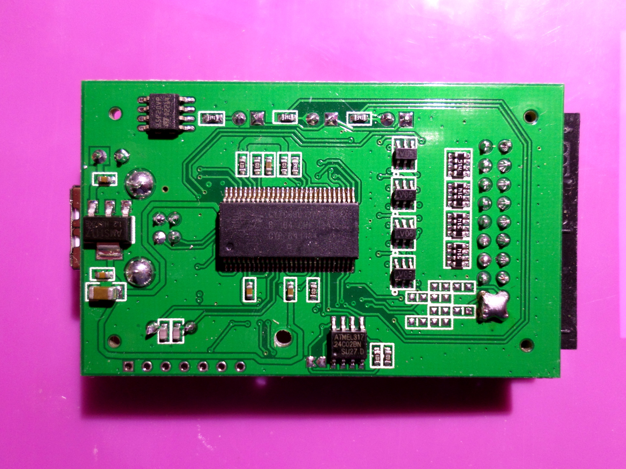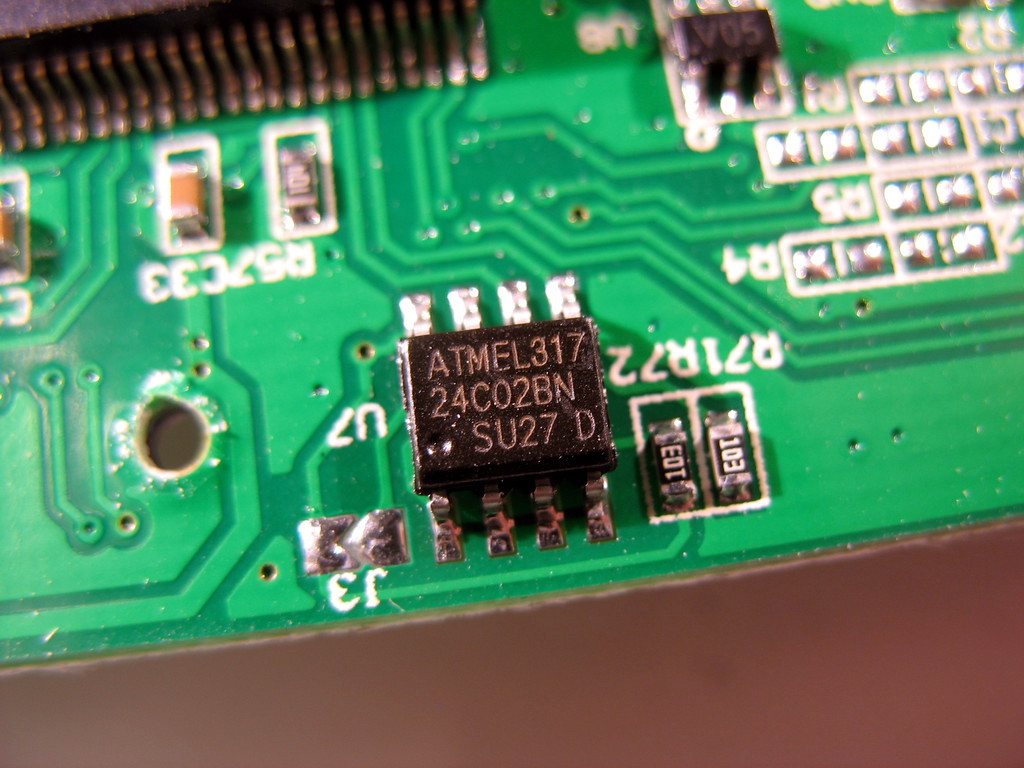 - I2C EEPROM: 2Kbit Atmel 24C02B (markings: "ATMEL317 24C02BN SU27 D") (datasheet)