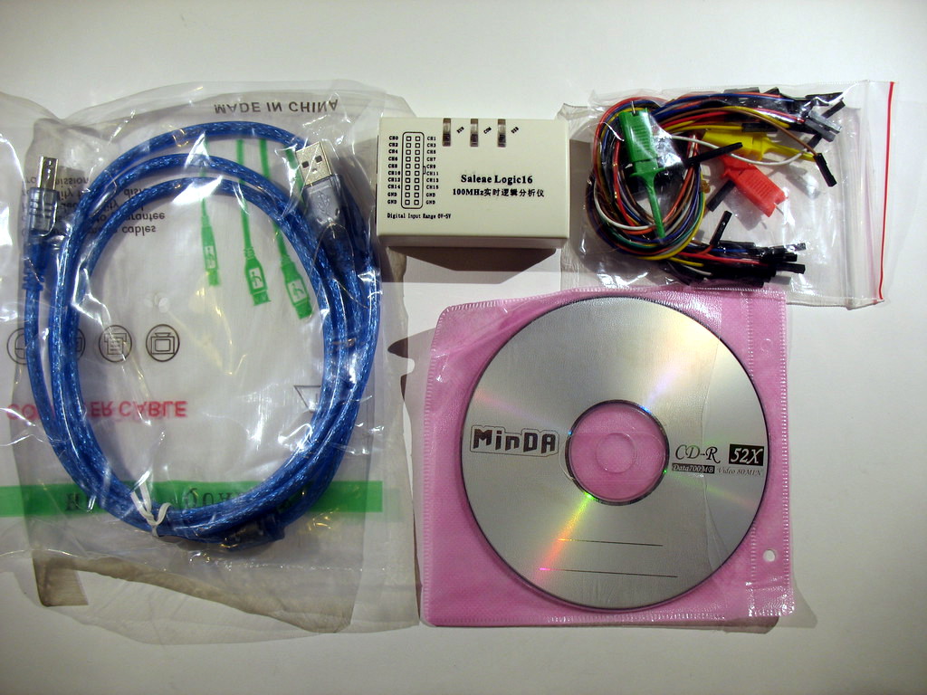 It is labelled and sold as a Saleae Logic16 clone, and comes with "modified" Saleae Logic software on a CD-ROM.