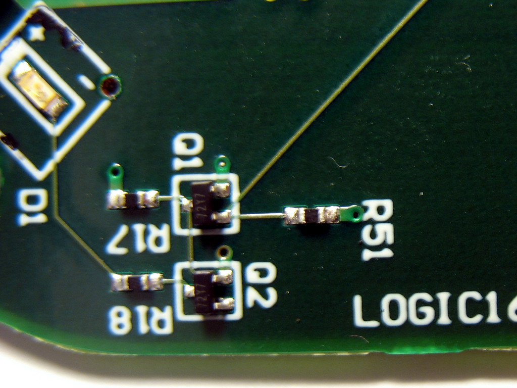 - N-MOSFET: 2x 2N7002 type MOSFET (marking: "72Y7"). Connected as "low-side" switch/LED driver and inverter.