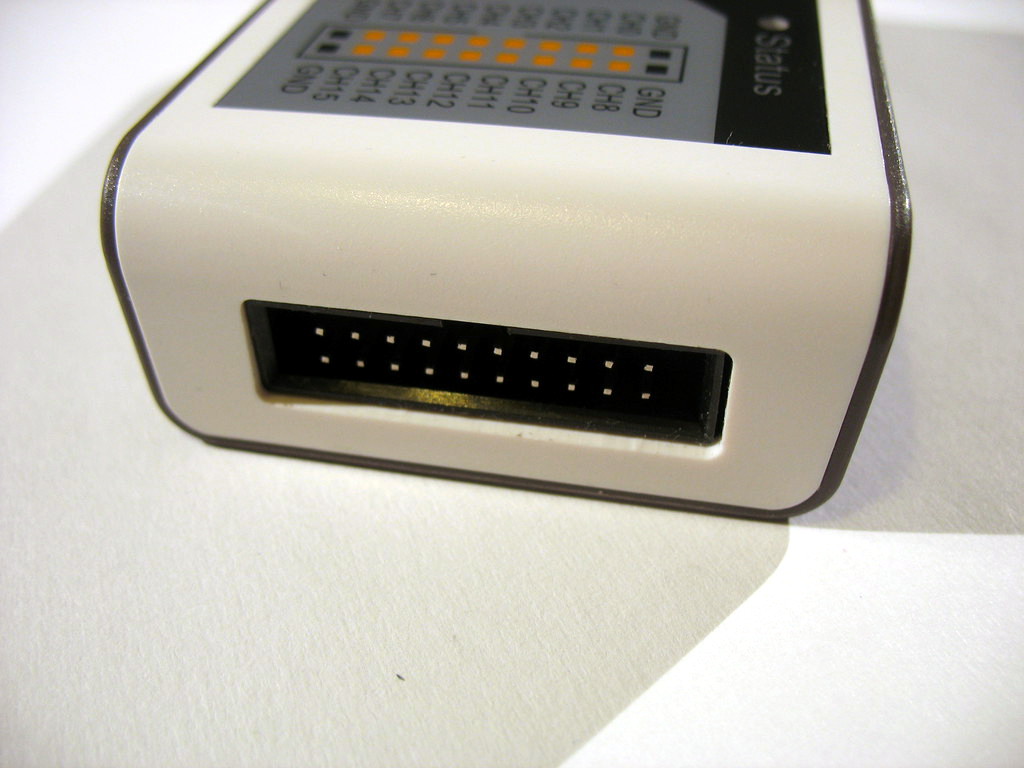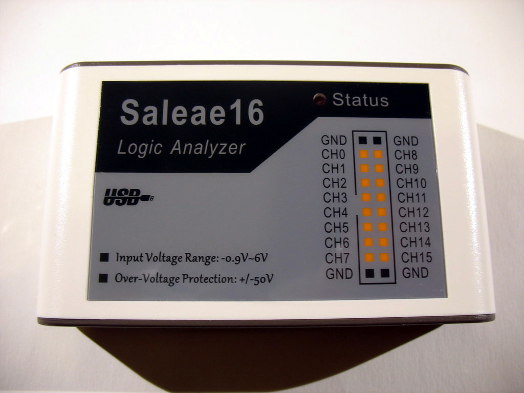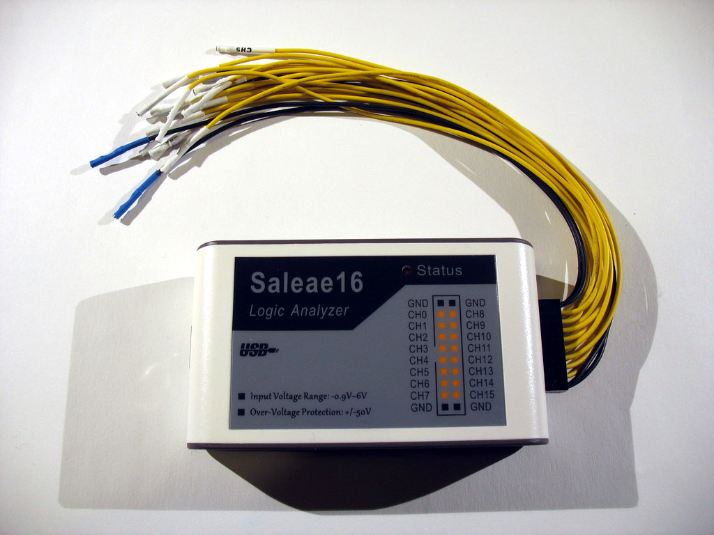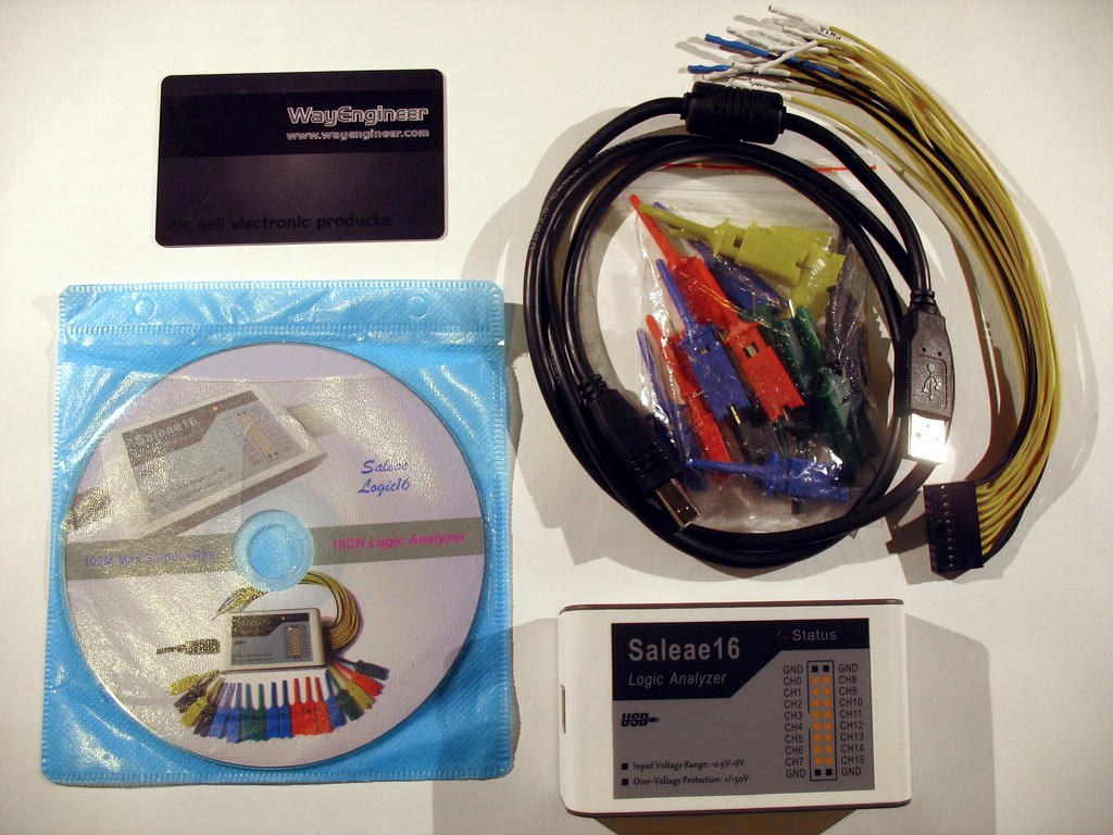 The WayEngineer Saleae16 is a USB-based, 16-channel logic analyzer with 100/50/32/16MHz sampling rate (at 3/6/9/16 enabled channels).