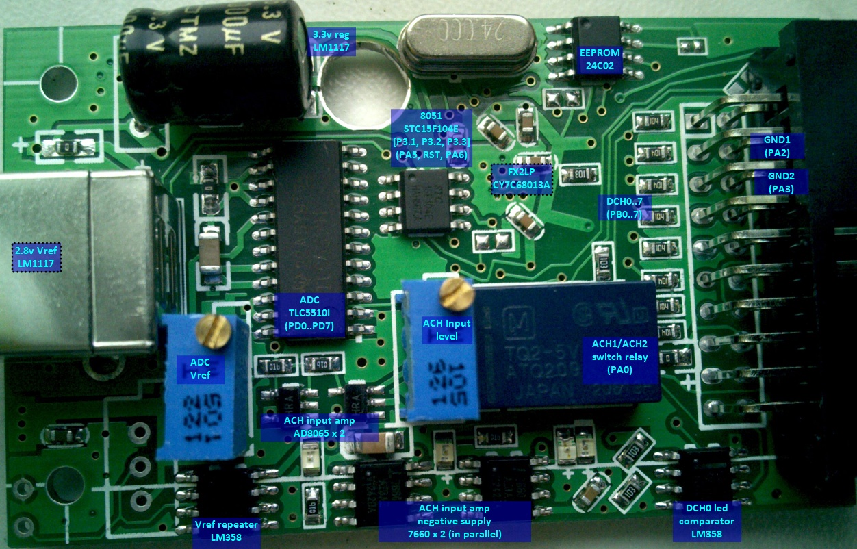 - Main chip: Cypress CY7C68013A-56LTXC (FX2LP)