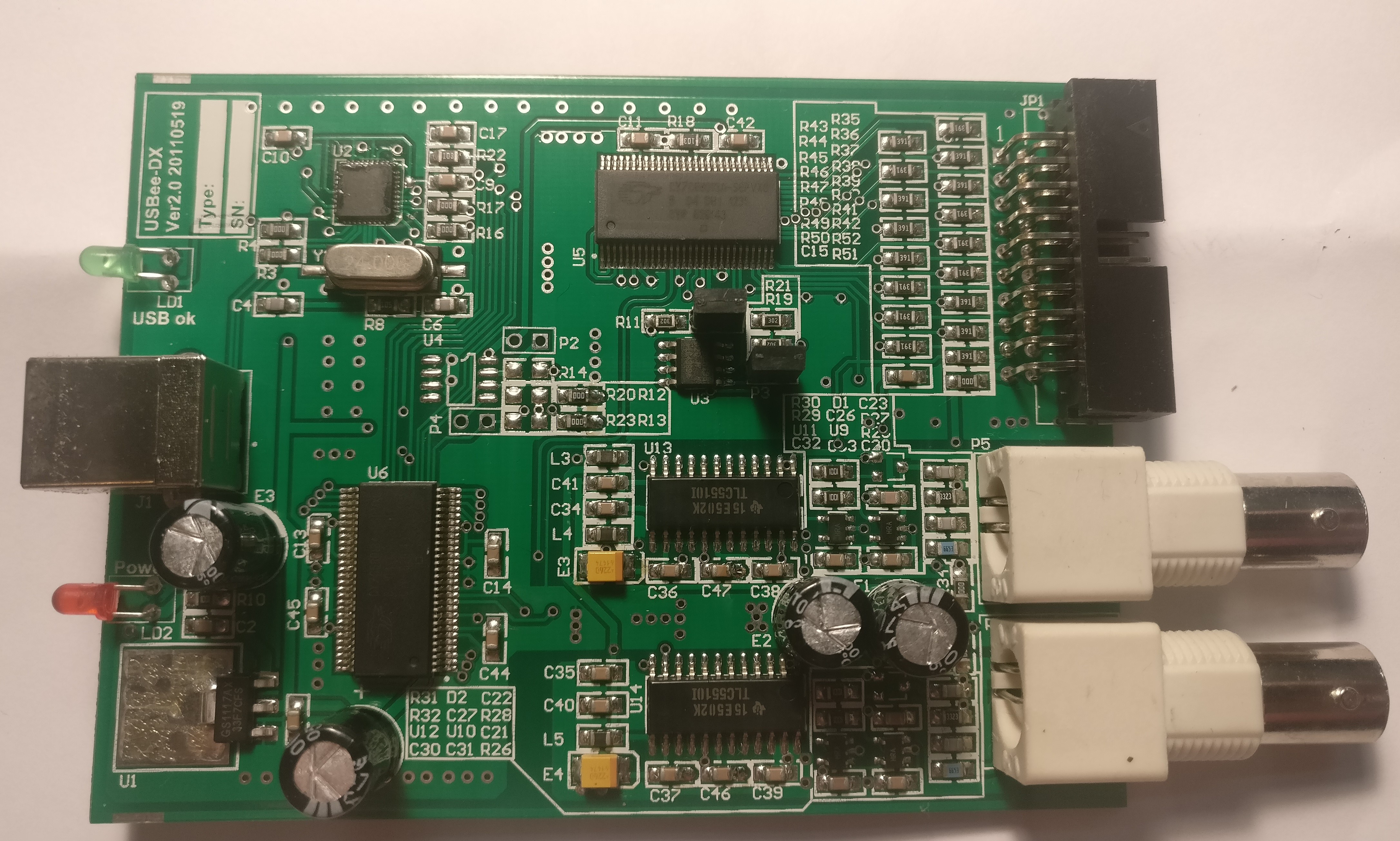 - Main chip: 2x Cypress CY7C68013A-56LTXC (FX2LP)