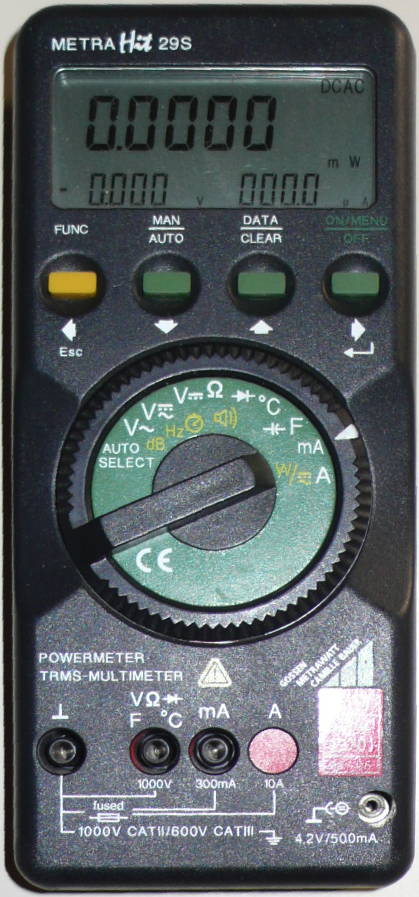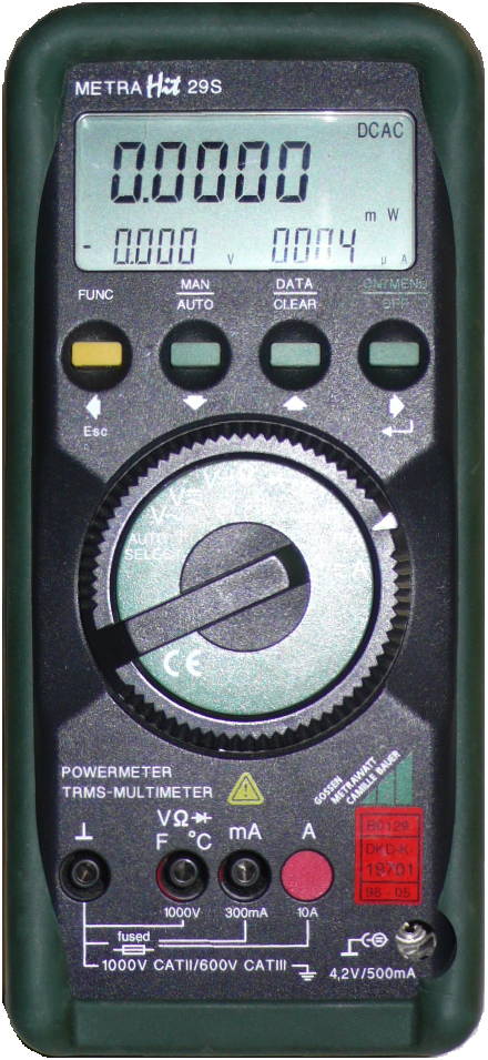 The Gossen Metrawatt Metrahit 29S is a 310000 counts 1000V CAT III/600 V CAT IV (older version) or 600V CAT III/300 V CAT IV (newer version) handheld digital multimeter with IR (RS232/USB) connectivity.