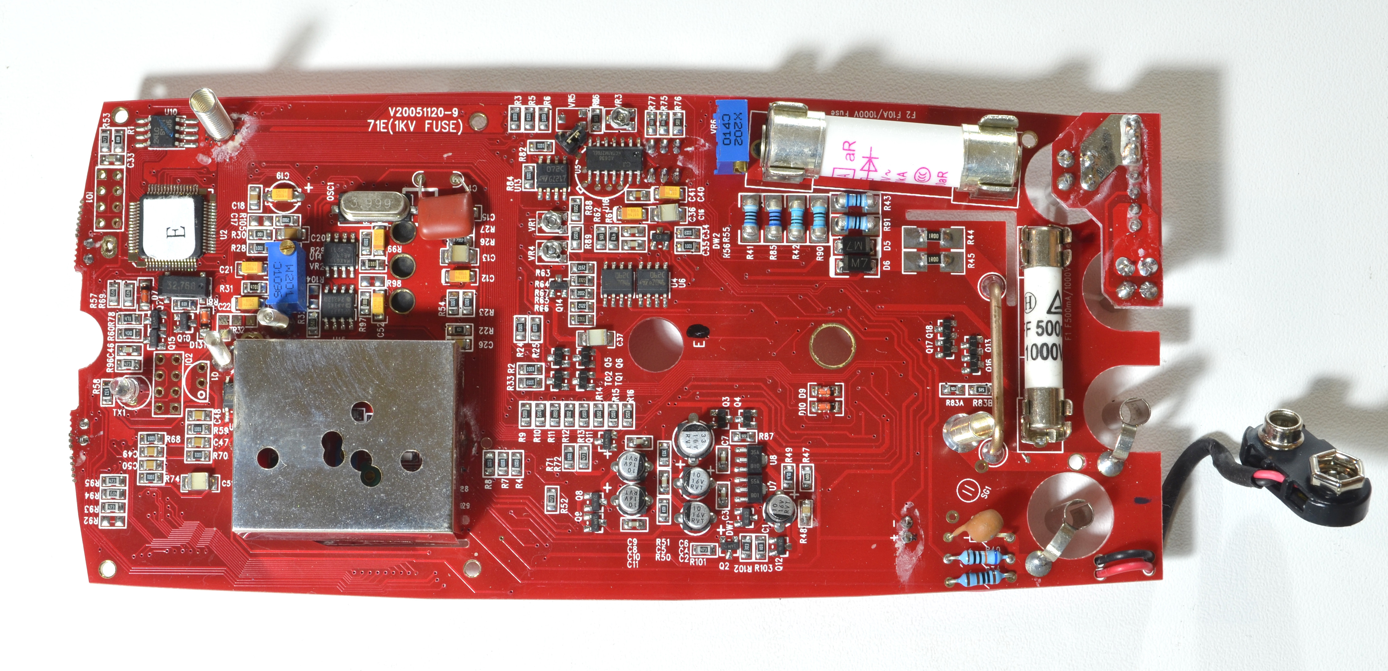 - PCB markings: The silkscreen reads "71E (1KV FUSE) V20051120-9", but an additional "E" model indication is apparently added manually by UNI-T using a sticker.