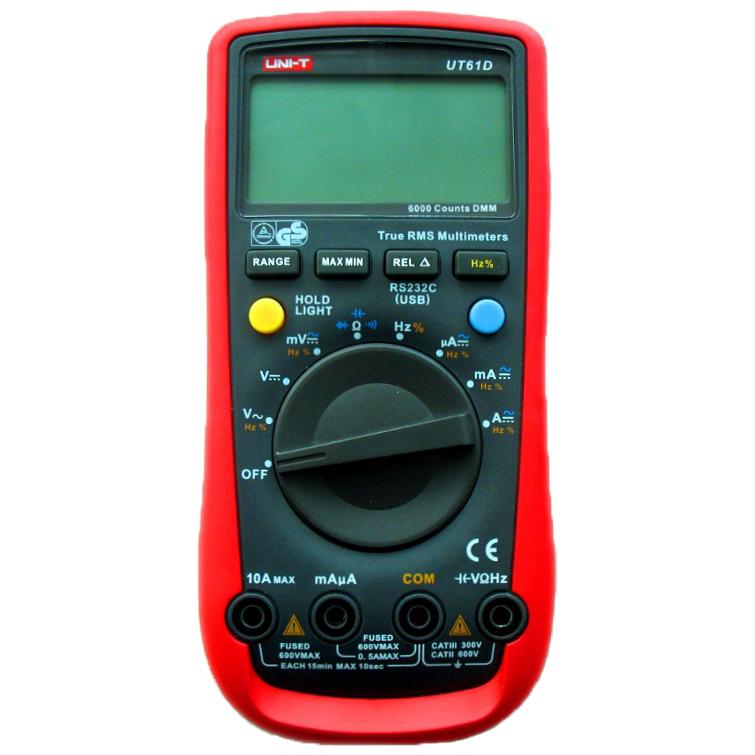The UNI-T UT61D is a 6000 counts, CAT II (600V) / CAT III (300V) handheld digital multimeter with RS232 or USB connectivity.