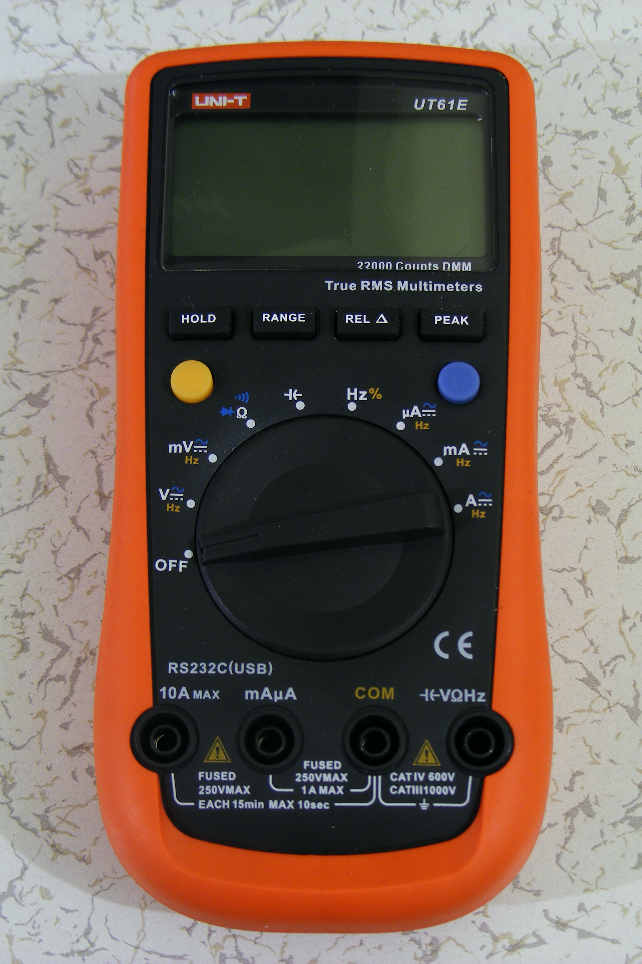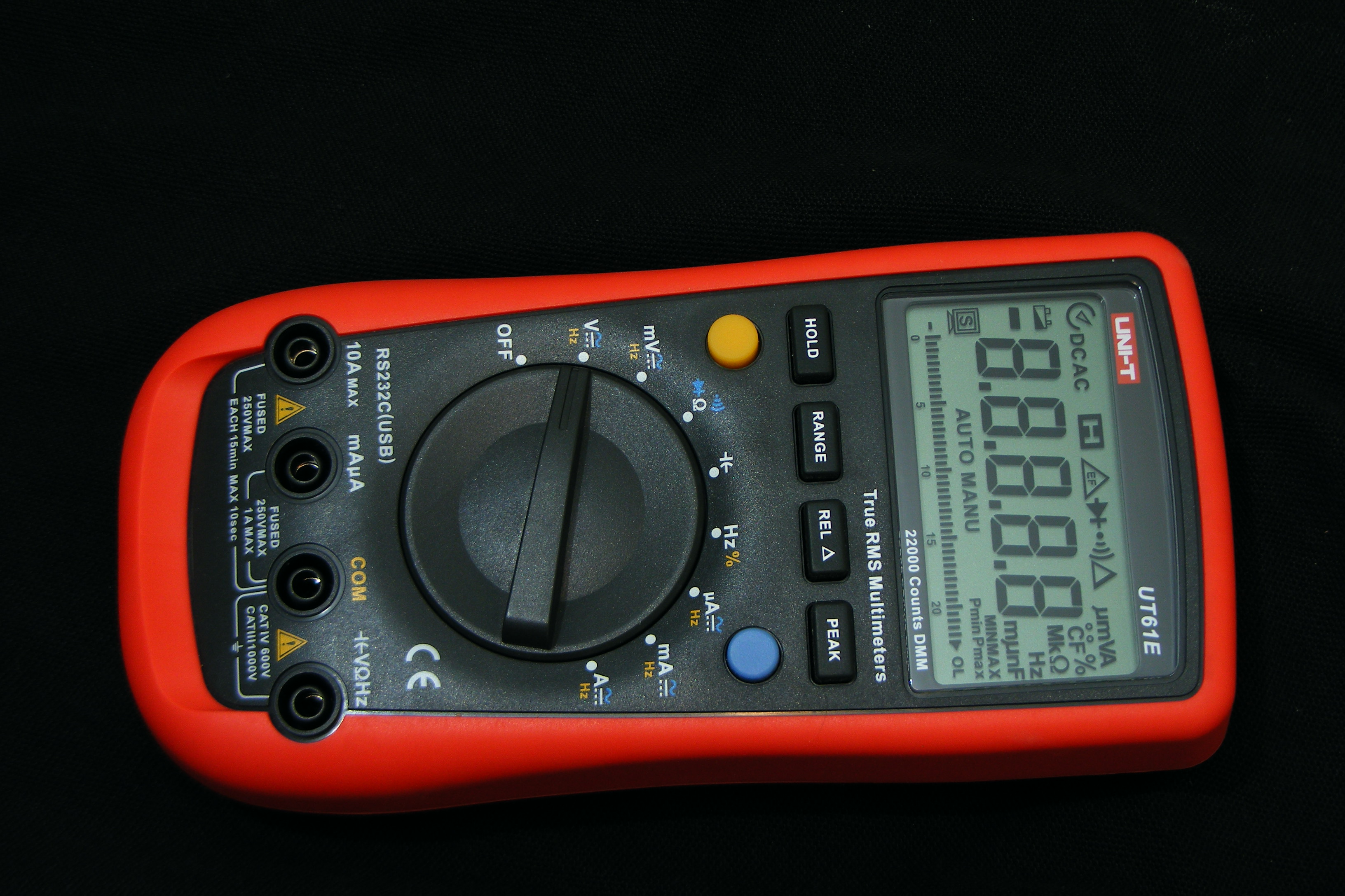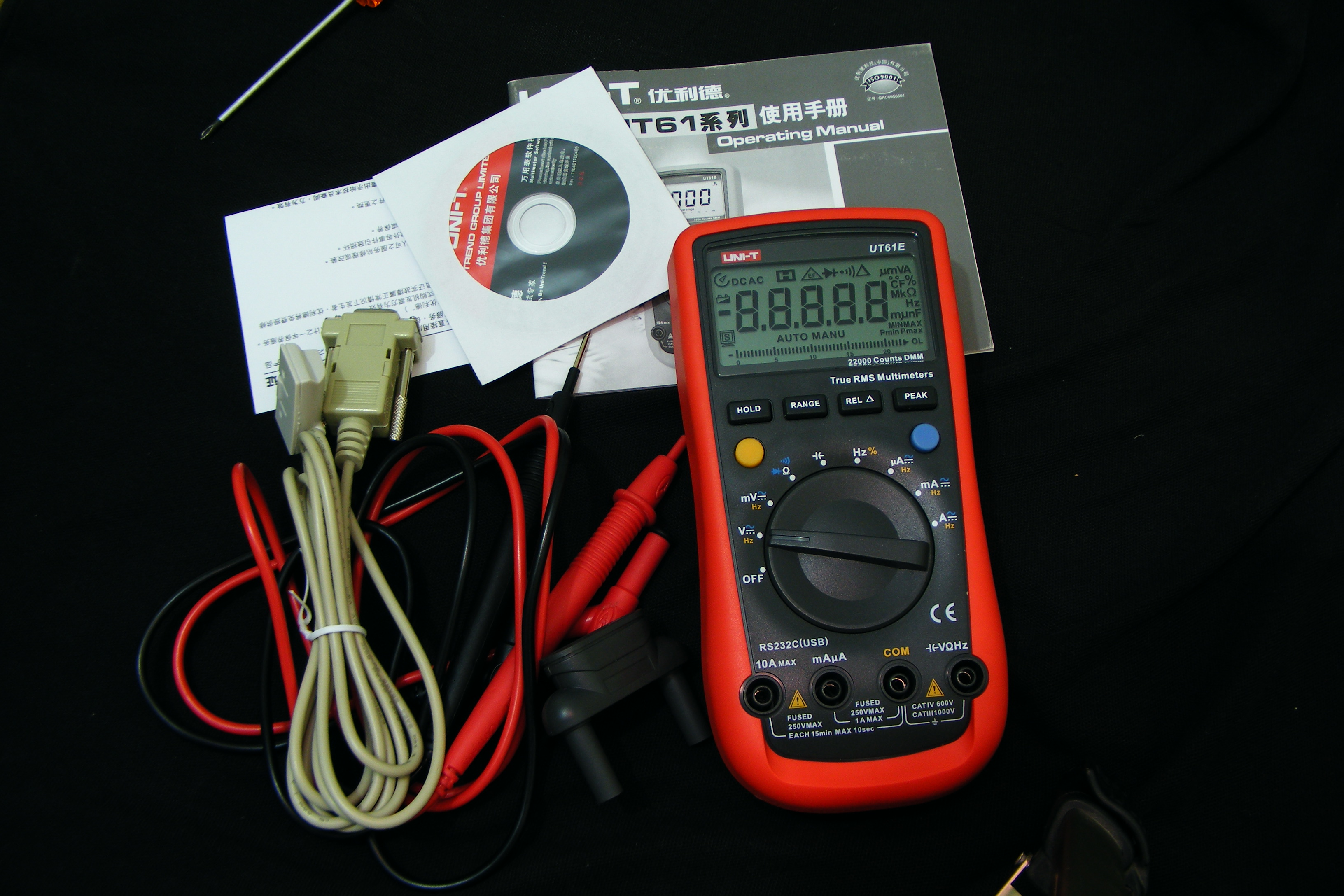The UNI-T UT61E is a 22,000 counts, CAT II (600 V) / CAT III (300 V) handheld digital multimeter with RS-232 or USB connectivity.