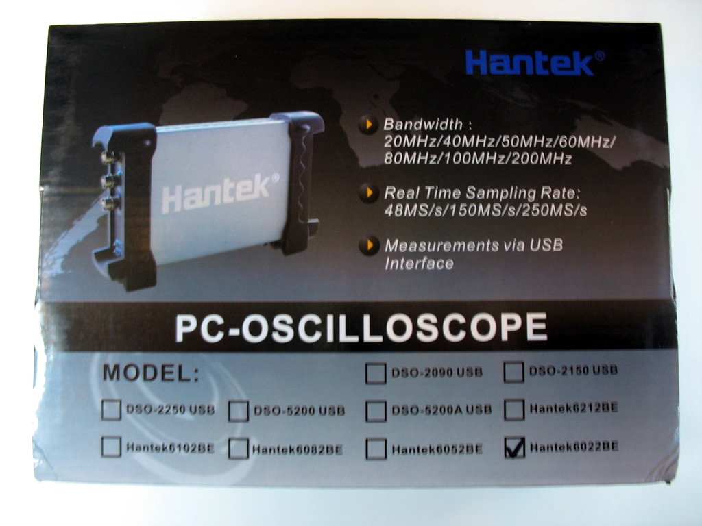 The Hantek 6022BE is a USB-based, 2-channel oscilloscope with an analog bandwidth of 20MS/s and 48MS/s sampling rate.